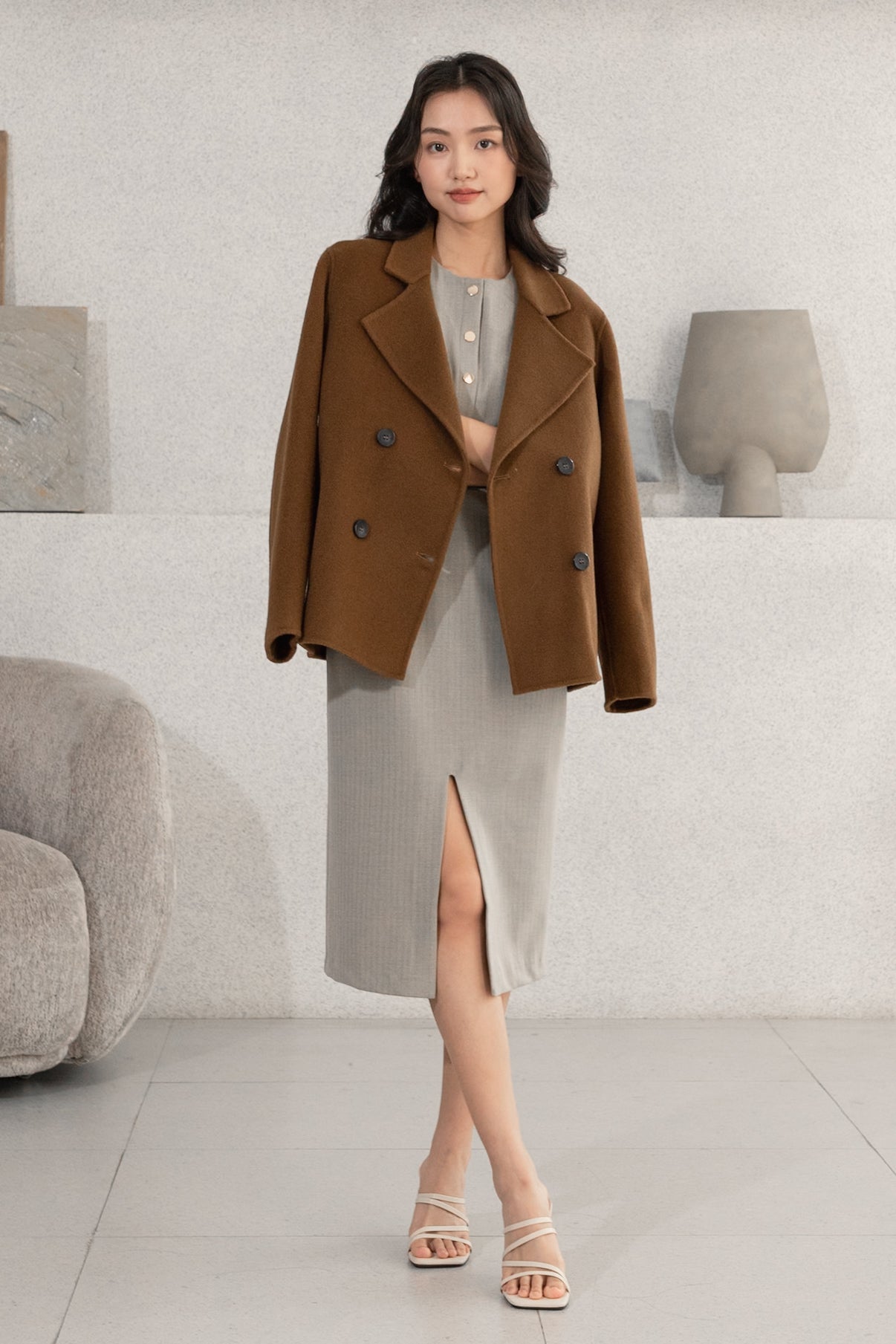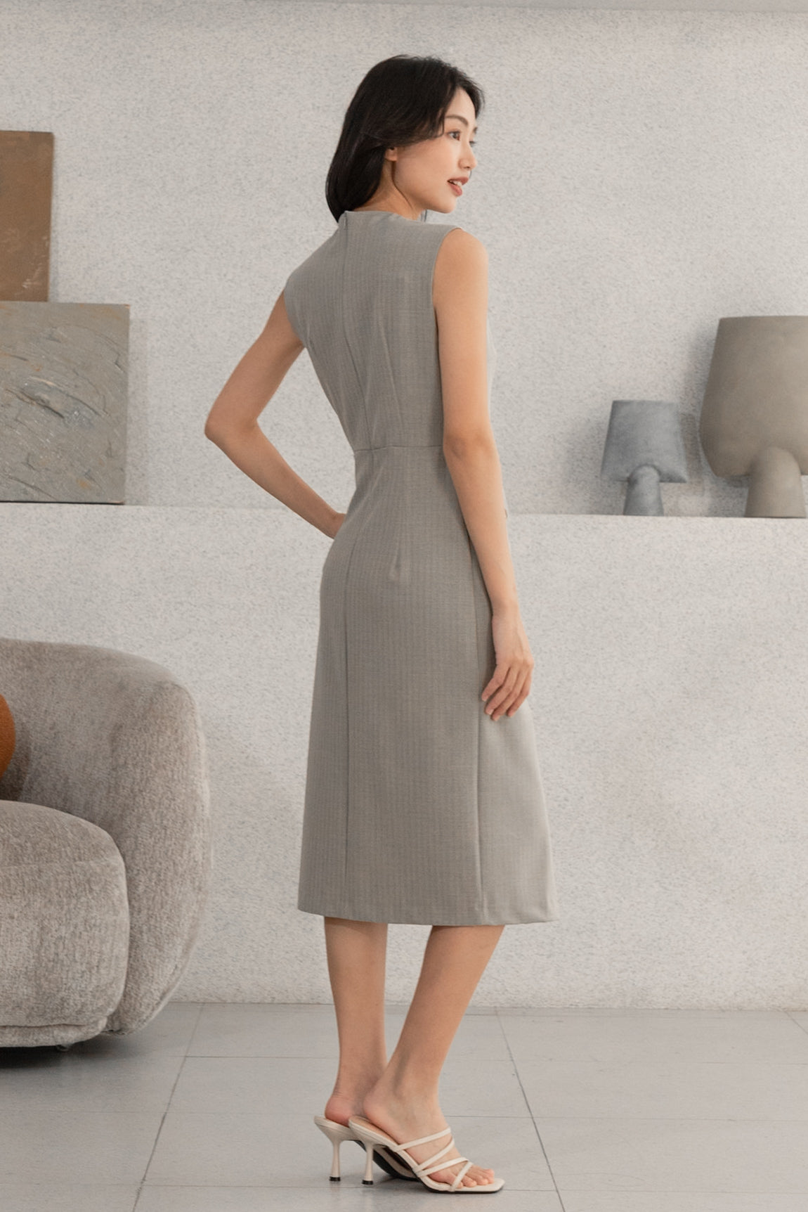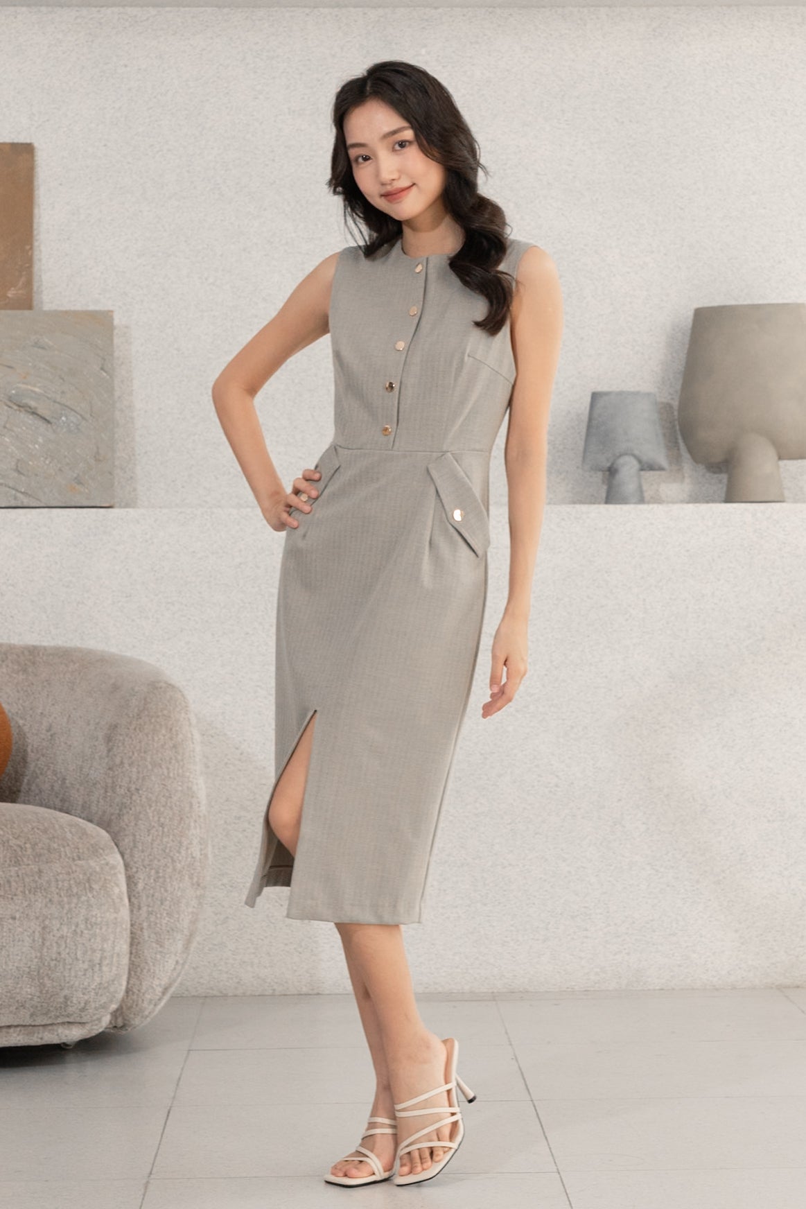 Gavin gold buttons grey midi dress